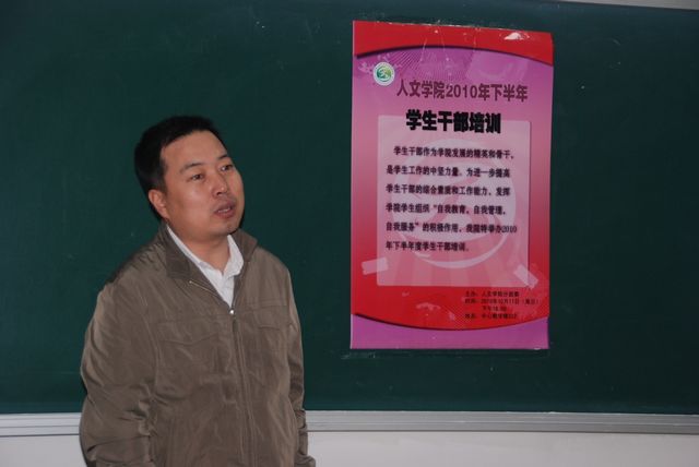 10月17日至19日,米兰milan官方网站人文学院2010年下半年全体学生干部培训在中心教学楼322教室举行。本次培训活动本着提高学生干部的综合素质和工作能力,发挥学院学生组织“自我教育,自我管理,自我服务”的积极作用的目的,进行了为期三天的学生干部培训培训,本次共分三场举行,邀请校团委书记徐强,人文学院副书记、副院长徐贵宝,人文学院副院长贾利军及人文学院分团委书记贾效明作报告,来自人文学院各个学生组织的近80名学生干部参加。