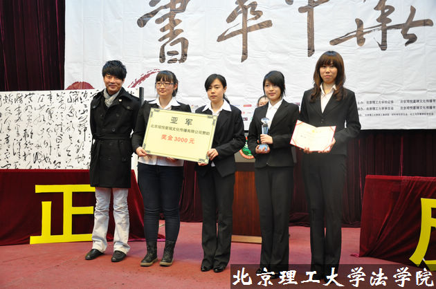 正方人文学院的辩论观点为“发扬书法艺术应走精英路线”,法学院作为反方的辩论观点为“发扬书法艺术应走大众路线”。对如何发扬中国的书法艺术,正反双方给出了不同的答案。正方认为,精英路线有助于传承和提升书法艺术的精神内涵,进而促其发扬;而反方则认为,大众路线可以扩大书法艺术的群众基础,使其更好地融入大众的生活,在广度上助其发扬并实现书法艺术的社会价值。经过激烈的交锋与对决,正方人文学院浓郁的文学风使其辩手更好地理解了书法艺术的本质,并夺得本次辩论赛决赛的冠军;而法学院的辩手们也不输风采,以昆曲和三弦因无大众基础而处于落寞状态等具体事例为引证,论证在当今快节奏、电脑科技化的社会生活状态下,为避免书法艺术沦落,只能依靠群众路线,实现书法艺术的社会价值。同时,法学院的辩手们结合自身扎实的专业功底,睿智思辨、理性论证,优雅的辩风和生动活泼的辩论特点给观众留下了深刻印象,最终获得比赛亚军,法学院二号辩手蒋雪同学也被评为全场比赛的最佳辩手!