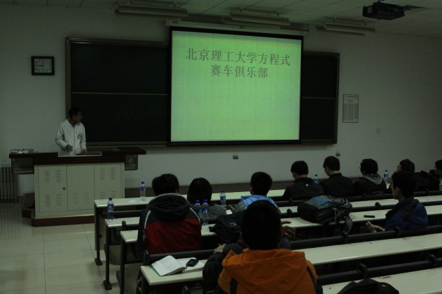 当天晚上,方程式车队主力队员一行六人来到良乡校区理教102教室,就BITFSAE车队的发展历史进行了回顾,并由车队第一届研发团队围绕冠军赛车“黑鲨”的设计制作进行了简要介绍,与大家分享了其设计过程中的传奇故事,同时,俱乐部还介绍了米兰车队与俱乐部的制度与构成,还原了一个真实的米兰方程式车队。