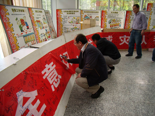 宣传活动于上午10点正式开始。当每一位同学经过宣传台时,我们便向他们发放防灾安全知识手册,宣传防灾安全知识的必要性和重要性。同时,我们请同学在写有“提高安全意识,防灾减灾从我做起”的横幅上签名,不到一个小时的时间,条幅上就已经签满了同学们的名字。为了检验同学们是否真正了解防灾减灾的安全知识,我们还特别准备了防灾减灾知识问卷,内容涉及地震、火灾逃生、消防器材使用、交通安全、食品安全卫生等方面,通过答卷加深对防灾减灾知识的理解。凡参与此次答卷的同学还可以获得一份小礼品,我们的目的不是考试,而是让更多的同学真正熟悉生活中必备的防灾减灾知识,为他们在工作、学习、实际生活中的安全起到“防患于未然”的保障作用。