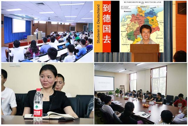 为了引导一、二年级同学更好地规划自己的学业和事业,作为“打开专业之门”活动的组成部分,机械与车辆学院于2011年6月17日在良乡校区组织了“到德国去”—德国交换项目报告会(下图左上),常务副院长唐水源教授和院团委书记王泰鹏带领我院2007级赴德交换同学向2009/2010级同学详细介绍了德国交换项目及相关准备工作(下图右上),鼓励同学们拓展国际化教育经历、积极参加德国交换项目。崔振海等六位2007级赴德交换同学针对2009级本科同学关心的“赴德交换的要求和条件”、“申请程序”、“准备手续”和2010级本科同学希望了解的“职业规划中的国际化教育选项”、“德国交换学习的收获”、“德国学习的挑战与生活适应”等问题作了细致的解答。