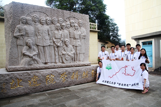 本次探访自然科学院遗址与以往不同,在出发前,经过实践团全体成员讨论研究,为了缅怀为学校建设发展做出贡献的先辈,将老校址参观和校史学习相结合,实践团在自然科学院遗址现场举行了“感怀理工起点 寄语百年北理”的主题教育活动。 队员们在纪念碑前摆出自北京带来的1940年以来的校史图片,由郭惠芝老师为担当讲解,结合校史图片详细生动的向全体队员们讲述了我校72年来的历史变迁、杰出校友以及为国家建设做出的突出贡献。当承载着理工历史足迹的图片背靠着纪念碑,当72年的发展历程在自然科学院遗址上被娓娓道来,全体队员都被深深感动,在理工的起点上,回顾校史,正式对建校先辈们最好的告慰。