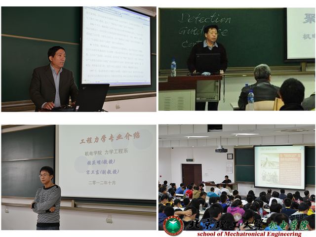 10月14日下午,机电学院在良乡校区开展2012年新生入学教育。院长焦清介教授主持本次专业教育,学院无人飞航系、能源与动力工程系、安全工程系、力学工程系、机电系统工程系、探测与控制工程系、智能机器人研究所系领导、院办、学院团委和2012级新生全体班主任参加。学院2012级全体新生及2011级部分学生聆听了一场生动的专业教育课。