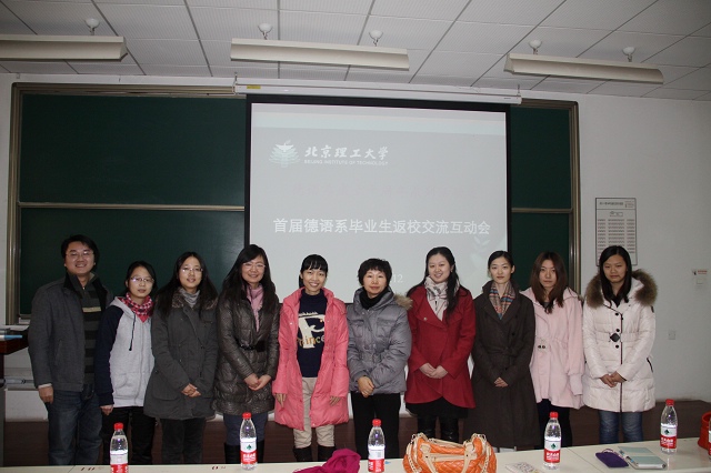 2012年12月1日上午10点,“听学长说那过去的事儿”——外国语学院德语系第一届毕业生返校交流会在理科教学楼104正式开始。来自外国语学院副书记副院长吴文君、02级德语系的四名校友代表出席报告会。辅导员周芳集携2010级、2011级、2012级德语专业学生参加报告会。报告会由吴文君老师主持。