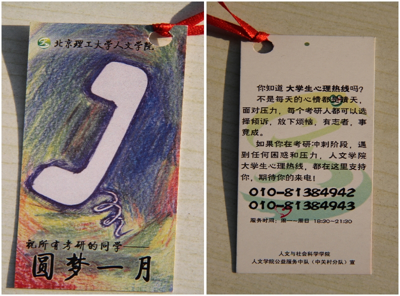 12月18日晚,2011-2012年度国家励志奖学金和国家助学金的七名同学组成人文学院服务中队中关村校区分队齐聚信息楼,在不同教室里向自习中的考研同学发放精心准备的“圆梦”主题书签。主题书签全部由人文学院学生自行设计绘制,书签正面写有“祝所有考研的同学圆梦一月”的助力口号,为考生加油;背面印有人文学院“全国大学生心理热线”的简要介绍和电话号码,欢迎同学们在备考阶段致电纾解压力,调节情绪,以更好的身心状态迎战研究生入学考试。