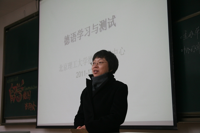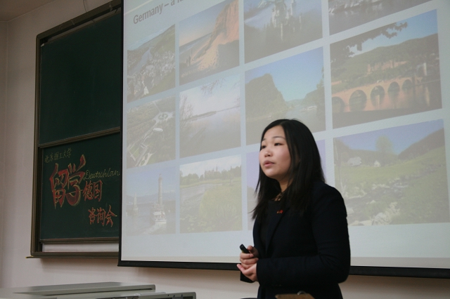 首先是由德意志学术交流中心驻京办事处教育推广负责人刘㛃女士做了题为《在德国学习与研究》的专题报告。刘女士分别从德国的人文历史、国情概况、科学技术、大学教育等方面为切入点,全方位的介绍了德国高校如今的发展状况,加深了同学们对于德国大学的了解。