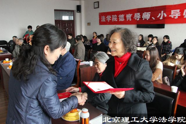 离退休老干部第十三党支部的9名老干部与法学院09级9名优秀学生被聘任为23111202班德育导师。离退休教职工党委书记娄秀红、法学院党委书记刘存福、法学院副书记副院长张巍、法学院团委书记聂宁宁、23111202班班主任于鹏、团委副书记韩笑,以及法学3班全体同学参加了本次聘任仪式。