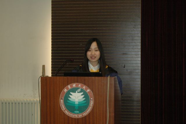 陈姝代表毕业生发言,两年多的青春岁月里,他们见证了母校的发展,也收获了自己的成长,老师们的谆谆教诲让他们学会了分析与思考,学会了丰富与凝练,学会了合作与竞争,学会了继承与创新,如今,虽然即将向母校告别,但是他们必将铭记母校“德以明理、学以精工”的校训,秉承“团结 勤奋 求实 创新”的校风,为母校的腾飞谱写新的篇章!