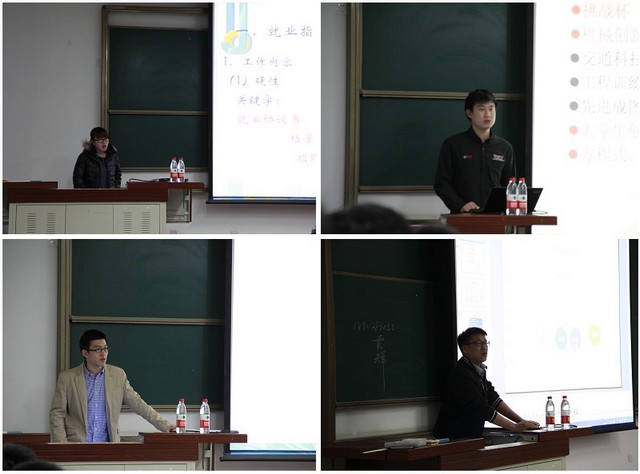 24日晚的活动主体集中在职业生涯规划指导和学生科技创新指导两个方面。机械与车辆学院就业指导中心坚持推进“系统化、全程化、全员化的大学生职业生涯教育研究与实践”,针对大学全程四年不同阶段的特点和可能出现的问题划分成了五个阶段:专业引导与适应期、专业学习与教育期、自我认知与规划期、能力训练与提升期及就业准备与实施期。这五个阶段伴随着学生在大学期间的成长轨迹,但不是互相孤立,而是相互关联、不断深化,并且每两个相邻的阶段总会需要一定的重叠和过渡。针对本科二年级的同学,金海鑫老师及董路宁老师分别围绕“大学生职业生涯规划基本方法”及“学生科技创新平台建设及参与途径”等内容进行了生动而细致的讲解及指导,参与同学均表示受益良多。