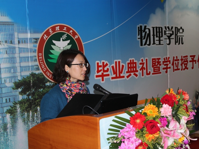 2010级硕士生孙娜娜同学代表毕业生发言。她代表毕业生对培育过鼓励过帮助过同学们的物理学院和老师们表达了诚挚的谢意。并回望在北理学习几年来的点点滴滴,有感动更有不舍。现在毕业也正是一个新的起点,同学们将带着老师的殷切期望奔赴四边八方,为祖国建设贡献力量,用实际行动“爱校”、“荣校”。