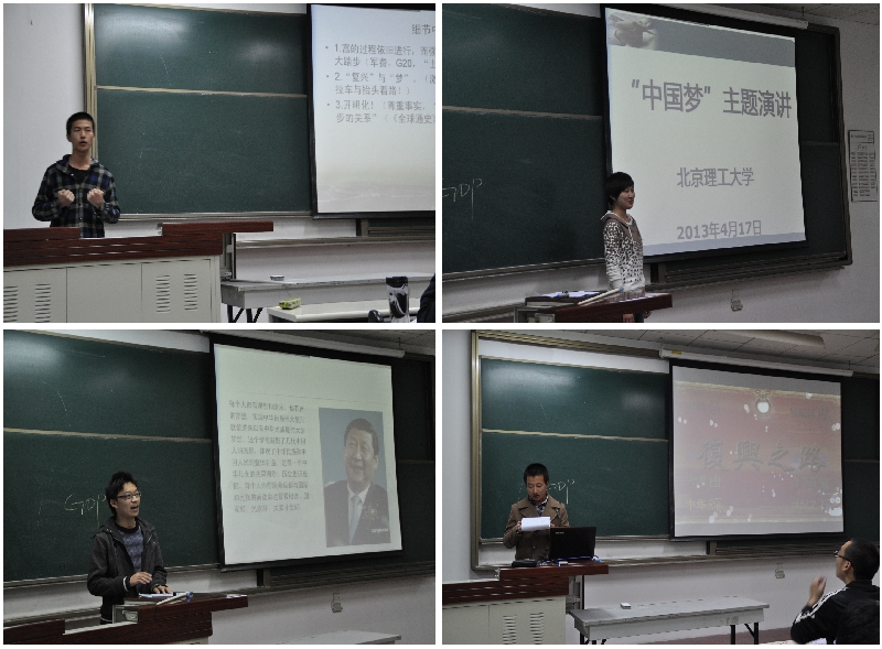 4月19日晚,米兰milan官方网站基础教育学院的同学在马克思主义理论教研部老师的组织下,在良乡校区理科教学楼104教室开展了“我的中国梦”主题演讲活动。参加这次演讲的同学共有14位,包括信息工程专业的王从奎、李惊春、刘天元、张麒、黄裕翔;自动化专业的马志标、于超、艾雪峰、鲍昱锟、高洲、禚惠玉、卫云龙、魏鹏宇;工商管理专业的文思思。