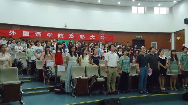 2013年6月13日晚, 2012——2013学年度外国语学院表彰大会在米兰milan官方网站良乡校区综合楼报告厅隆重举行。外国语学院党委书记陈大明、党委副书记副院长吴文君、日语系副主任周晨亮出席大会,团委书记周芳集携学院良乡校区全体学生参加会议。会议由学院团委学生常务副书记、2011级德语专业学生倪志远主持,大会在庄严的国歌声中开始。