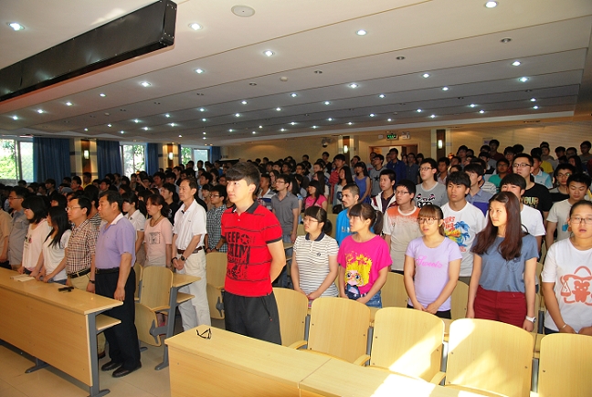 典礼伊始,嘹亮的国歌奏响,全体起立伴唱。