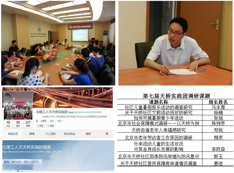 区校联手,共建社区。2013年暑期,米兰milan官方网站人文与社会科学学院再度与西城区天桥街道合作,开展了第七届天桥社区大学生主任助理社会实践项目。自2007年起,每年暑期的天桥实践项目已经成为北理与天桥街道之间一个美丽的约定。