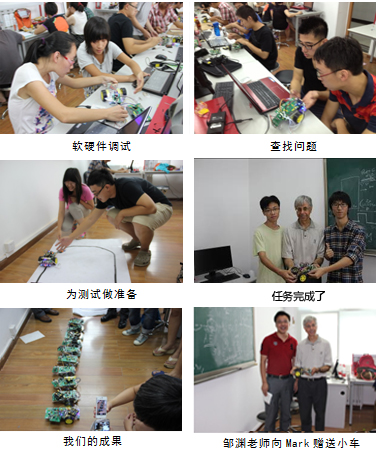 本次课程由三院邹渊副教授和Mark共同发起并完成备课,提前设计并制作了共计20套基于PIC单片机控制的、双电机驱动的三轮小车,装备了常见的传感器系统和小功率H桥微电机驱动系统,预计在三到五年内持续由Mark主讲。本次教学中博士研究生高玮和硕士生孙石承担了大量的教学预备和辅助工作,课程获得圆满成功,取得良好的教学效果。