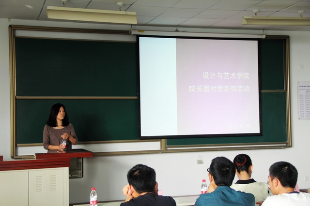 此次院长面对面系列活动分为院长专业引导报告和院长访谈两个部分。为帮助学生更全面的认识所学专业,更好更快的融入大学生活,设计与艺术学院副院长杨新老师针对2013级本科新生,从设计学院的学科基本情况、专业课程及课程内容等几个方面做出了专业引导报告,并希望大一新生在今后的学习生活中树立远大目标,努力学习专业知识,积极锻炼并提高实践能力,圆满完成学习任务。