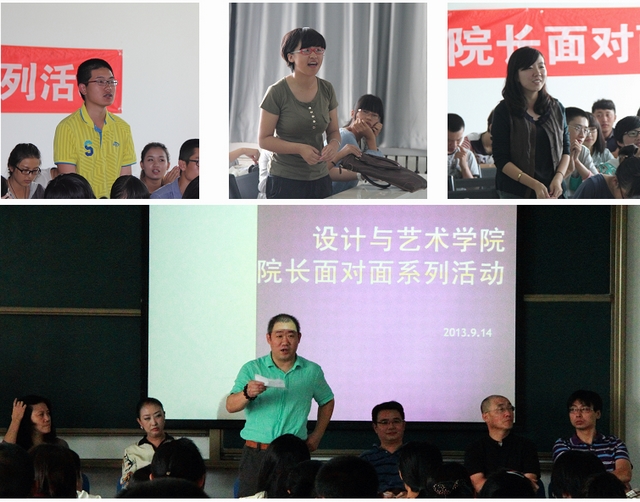 为秉承优良学风,提高学生自身的专业素养,拓展学生思路,增强学院的学术氛围,设计学院积极响应学校号召,于9月14日上午9:00在良乡校区综合教学楼A303举办院长面对面系列活动。设计与艺术学院副院长杨新,副院长姬勇,副书记、副院长孙飞,院长助理李爽、程九军、邱越及全体2013级本科新生参加了此次活动。