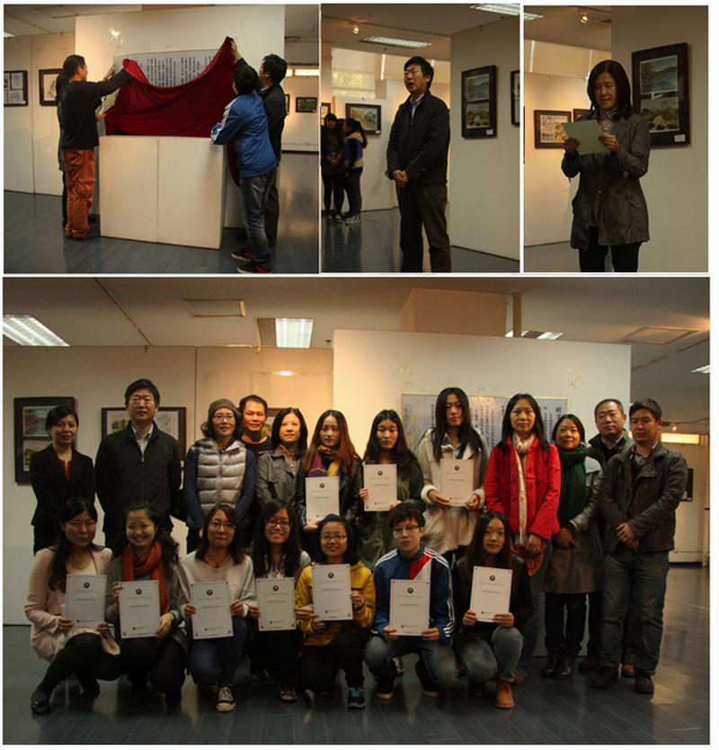 开幕式上学院党委书记郭宏为本次的写生展览致辞,对学生的作品给予了肯定,指出学院每年组织的写生活动目的是让同学们将课堂上学到的技能加以实践,得以提高,并希望同学们在与大自然接触的过程中产生灵感,创作出优秀的作品。致辞完毕,郭宏书记、杨新副院长等一同为付琳等获得优秀作品奖的学生颁发获奖证书并合影留念。学生代表谢易晋对本次活动发表演讲,在感谢学院给予的这次写生机会的同时,也讲述了外出写生的切身感受与体会,表示在此次写生过程中不管是专业技能还是审美能力都有了较大程度的提高。