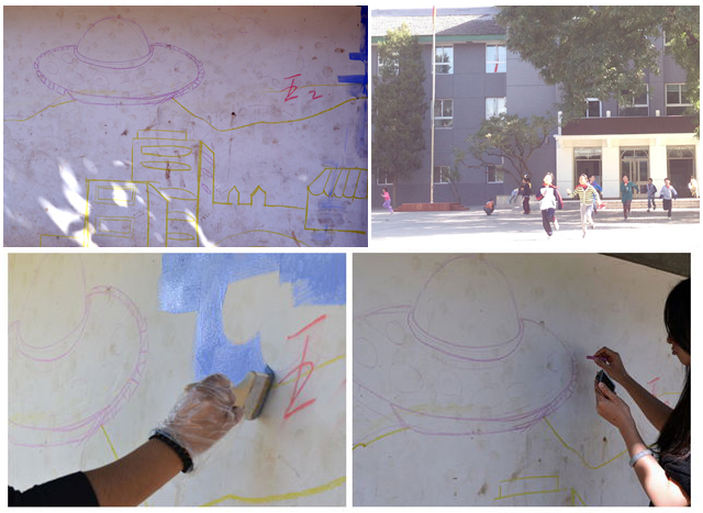 经过简短的讨论和分工后,团支部成员开始了涂鸦活动。看到有人在墙壁上涂鸦,小学生们感到很好奇,纷纷围观驻足,有的小学生主动拿起画笔参与到了涂鸦活动中,他们看着草稿,手头笔尖自如书画,充分发挥着他们的想象力与创造力,支部成员们也被小学生们的热情与阳光所打动,更加认真地在墙壁上绘画起来,不一会儿一幅色彩缤纷的涂鸦作品就完成了。
