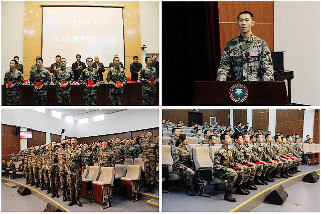 国防生李世杰代表全体新生发言,他怀着无比豪迈的心情,号召全体国防生从严从难磨练自己,尽快完成从青年学生到合格后备军官的转变。 2012级学长李唱白带领全体新生宣读国防生誓词,用铿锵有力的语言表达了志愿成为中国国防生、为国防和军队现代化建设贡献力量的决心和信心。