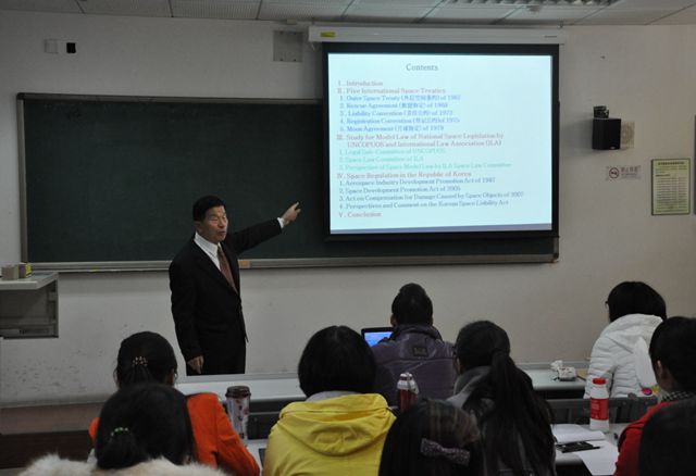 金斗焕教授现任亚洲航空宇宙法学会理事、国际宇宙学会会员、国际计划委员会委员和韩国航空宇宙法学会名誉会长。这次金斗焕教授的学术讲座使同学们受益匪浅,开拓了同学们的视野,对于同学们了解亚洲各国家间的空间合作具有重要意义,对于我校空间法学科与亚洲空间法学者之间的交流有重要影响。