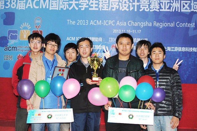 2013年11月16日-17日,ACM国际大学生程序设计竞赛亚洲区长沙站现场赛在湖南大学举行。我校派出由计算机学院林永钢教练指导,计算机学院、软件学院同学组成的两只代表队参赛。经过5个小时紧张激烈的比赛,我校参赛队在105所高校、192支队伍中脱颖而出,最终获得一金一铜的好成绩,学校排名第三位,获得季军。这是继2012年首次晋级世界总决赛之后,我校又一次刷新记录取得的最好成绩。其中,由易毅、梁耀波、刘星辰组成的BIT_laser 队获得金奖,由李子豪、李沛奇、于文楠组成的BIT_include队获得铜奖。