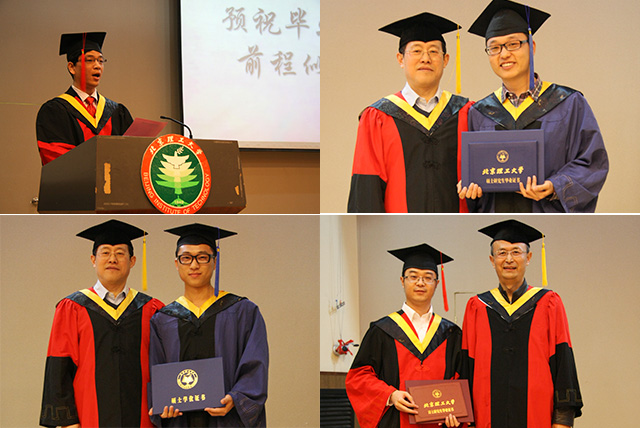 伴随着校歌,宇航学院2014届研究生毕业典礼顺利结束,随后进行了学位授予仪式。由胡更开教授、于倩教授、唐胜景教授和王宁飞教授一起为毕业生授予学位,随着相机快门的按下,留下了每位毕业生与导师们的合影,将典礼定格在这美好的回忆中。
