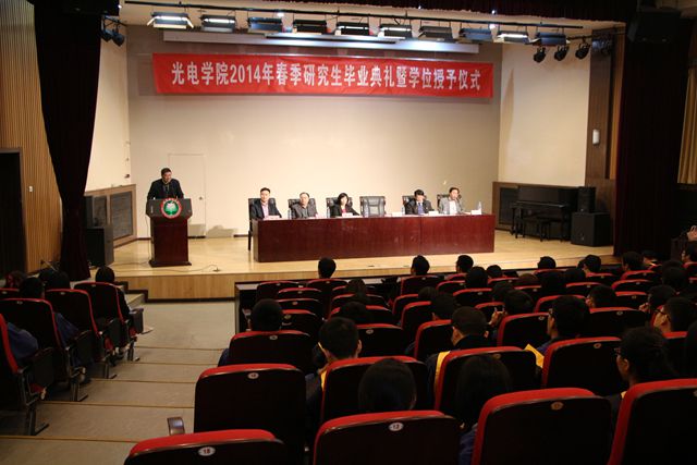 2014年3月24日上午,光电学院2014年春季研究生毕业典礼暨学位授予仪式在七号楼报告厅举行。出席典礼活动的学院领导、老师有:光电学院院长薛唯、党委书记郝群、副院长赵长明、许廷发、光电子研究所所长高春清,以及学院部分老师和家长。典礼仪式由学院党委副书记、副院长邹锐主持。 毕业典礼在雄壮的国歌声中开始。