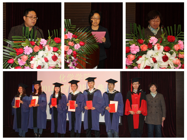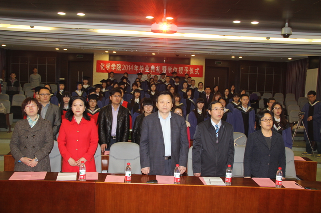 3月25日,化学学院2014届春季研究生毕业典礼暨学位授予仪式在研究生楼101报告厅隆重举行,学院全体院领导、部分教师代表、部分学生家属和全体毕业生出席典礼。