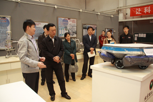 在参加团日活动前,侯宝森参观了大学生机械创新创业实践中心,机械与车辆学院团委书记王泰鹏汇报了相关工作开展情况,介绍了学院在教育一体化模式下,基于学院面向全校开展机械相关创新创业实践活动的机制、做法和成果,并介绍了以科技创新活动为平台实施“融入式”思想引领的成效。