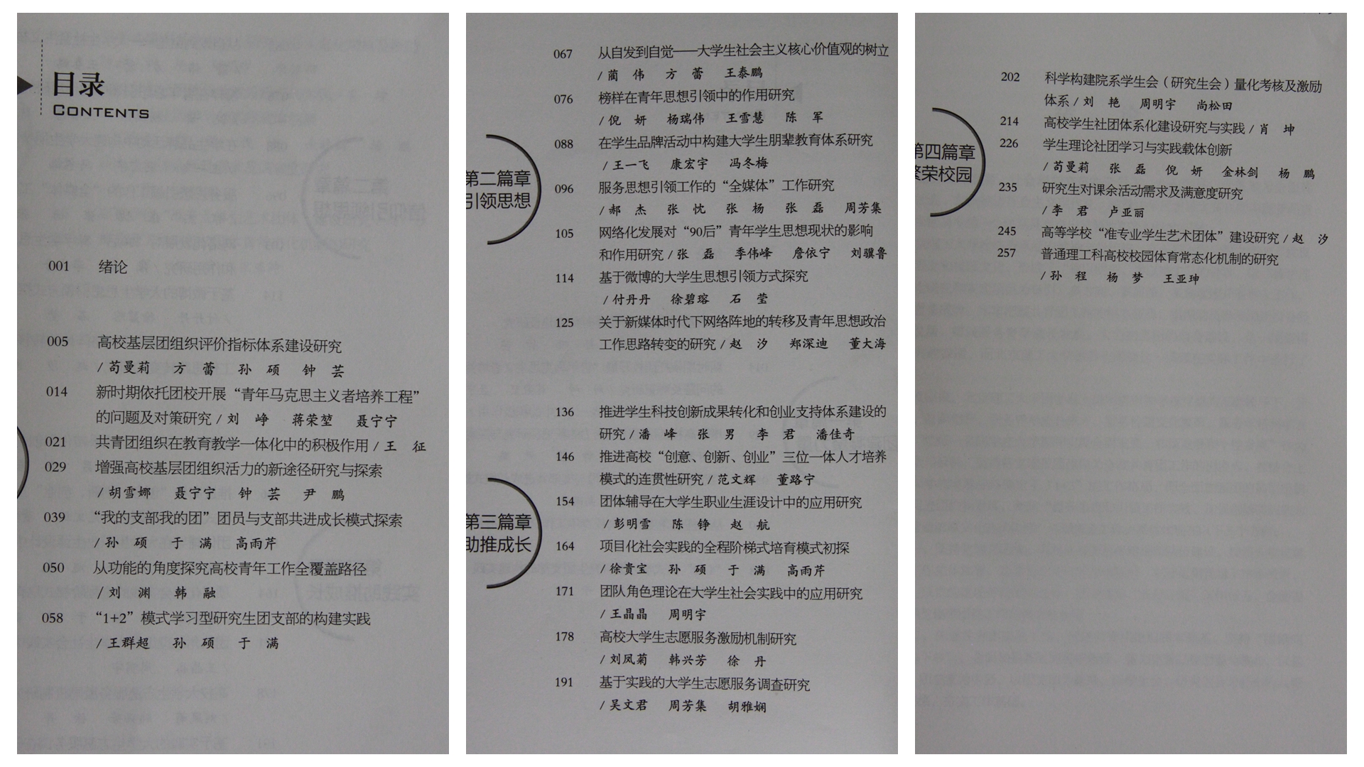 《德学研思》全书26.8万字,共有27篇文章,文章初稿均源自全校团干部的积极研究与实践,是一本具有鲜明共青团工作特色的研究文集。收入本书的文章为编者在此基础上进行进一步深化研究与总结而成,共分为“团建凝聚力量”、“信仰引领思想”、“实践助推成长”、“文化繁荣校园”四个篇章,这既是对高校共青团工作开展具有指导意义的理论成果,同时也反映出米兰共青团队伍的专业化建设水平和广大团干部勇于进取、不断创新的工作激情。