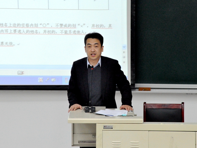 在计票统计环节,法学院党委书记杨海向与会全体党员同志介绍了学院综合改革的情况以及学院党委2015年整体党建工作计划,希望大家能够积极广泛的参与其中,为学院的发展献计献策。