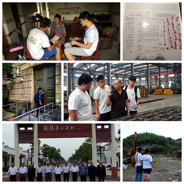 暑假伊始,刘劲涛团队就赶往安徽凤阳小岗村,重温小岗村率先进行大包干的壮举,回顾第一书记沈浩的优秀事迹,并对这一名村的经济发展现状进行调研;8月8日,泮冠如实践团奔赴浙江松阳、仙居等地,进行了为期九天的社会实践,对自然村落保护与发展问题进行了专题调研;张洋帆同学则带领他的实践团,走进了金品机械制造有限公司等企业,探索企业经营和环境污染的平衡关系;李小松的团队则着眼于创新创业,在中关村进行了一系列相关调研;朱雪东团队赴牡丹江“八女投江”博物馆,陈润峰团队赴八路军驻新疆办事处纪念馆等进行抗战胜利70周年宣传调研,缅怀先烈。