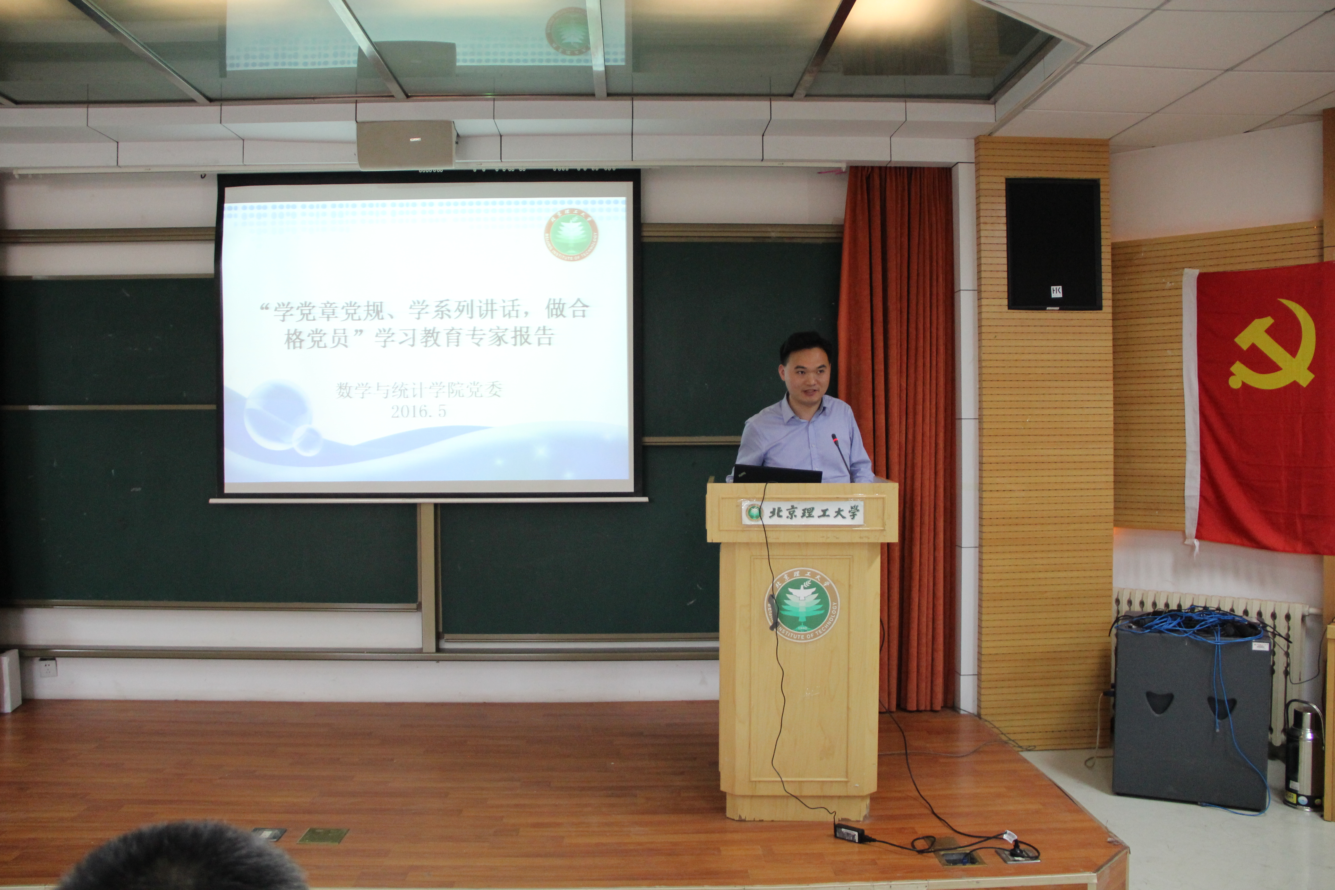 2016年5月10日下午1:30,数学与统计学院党委在良乡理学楼B106组织召开“两学一做”学习教育动员部署暨专家报告会,学校协调小组成员党委宣传部副部长肖坤及数学与统计学院全体师生党员参加,会议由学院党委副书记、副院长衡靖主持。