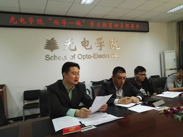 邹锐副书记介绍《光电学院党委关于在全院党员中开展“两学一做”学习教育的实施方案》,将任务分解、细化,明确责任。强调各党支部要召开支部动员会,把“两学一做”学习教育的精神传达到每一位党员,按照任务分解表的时间节点开展工作,并根据自身支部特点,积极策划,创新性地开展学习和实践活动,做到“一支部一特色”。