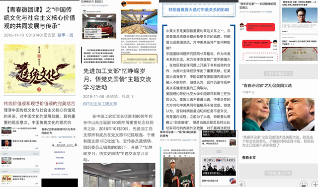 本次系列主题团日活动中,基层团支部累计开展交流研讨会41次,参观学习活动 23次,专题教育观影活动 17 次 ,开讲青春团课66次,青年评论文章119篇等。除了形式多样、成果丰硕的线下活动外,各基层团支部还积极巩固线上媒体平台,展开了丰富的线上学习活动,先后发布了“青春微团课”和“青年评论文章”等内容,通过线上传播鼓励团员青年学习党和国家的理论知识、了解时事热点问题、发布青年独特见解。其中03321402支部发布“居然有人这样学习社会主义核心价值观”的青年微团课,以视频和图片文字结合的形式向大众提倡和解读社会主义核心价值观,内容翔实,形式新颖,在广大青年中反响热烈;03111304支部发表以“特朗普胜选对中国的影响”为题的青春评论文章,结合当前国际热点问题关注并探讨国际形势,在青年团员中,引起了广泛的思考与讨论。
