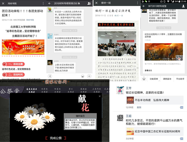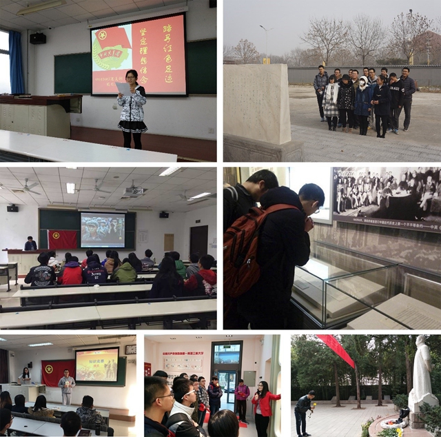 各基层团支部开展了形式多样的团日活动,其中本科生09011603团支部以“追寻红色足迹,坚定理想信念”为主题进行了爱国演讲,并组织观看红色电影,交流心得体会,一起回顾革命岁月。09011604团支部组织青年团员参观良乡烈士陵园,瞻仰烈士墓碑,感悟红色精神,并开展了相关知识竞赛,共读一本书等活动。09411501团支部参观了军事博物馆并召开“我与社会主义核心价值观”主题班会,弘扬了中华民族传统美德,爱国主义也深入每个人的心目中。09011605团支部参观了卢沟桥和抗日战争纪念馆,让团员加深了对历史的认识和铭记,更加深入的培养了爱国主义情感。 09221301团支部组织所有团员参观校史馆,进一步了解米兰milan官方网站的光荣历史,感受那个战火纷飞的年代,与祖国同呼吸共命运的理工大学师生的艰苦奋斗精神。09411301团支部组织班级同学学习习近平总书记纪念长征胜利八十周年讲话的视频,并组织团员们参加红色知识竞赛。09211401团支部组织全体团员前往万安公墓的李大钊烈士陵园,并组织团员们默哀鲜花,参观“李大钊烈士革命事迹陈列室”,了解李大钊同志一生英勇的革命事迹。