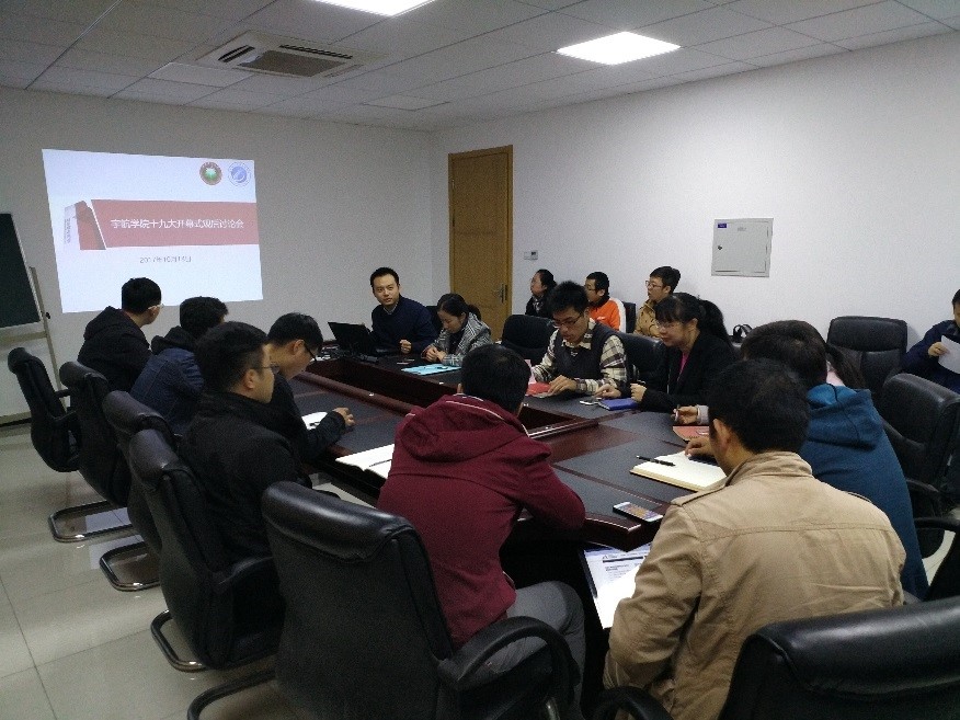 十九大开幕会盛况结束后,学院党委第一时间组织师生集中交流研讨。宇航学院党委书记曲虹组织院班子成员、教工代表在宇航楼530会议室开展集中研讨,大家结合自身理解就国家主要矛盾的变化、高等教育、“两个一百年”奋斗目标、建设美丽中国等方面发表自己的感受与体会。