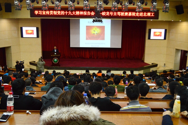 报告伊始,唐嘉陵带领同学们简要回顾了往届中国共产党全国代表大会的情况。随后,他根据自己的亲身经历给大家讲述了参加本次十九大的盛况。从下榻宾馆到进入会场,从17号下午的预备会到18号上午正式开幕,整个会议简洁而庄重。十九大首次开通党代表通道,唐嘉陵同志与景海鹏、赵宏博作为第一组代表与中外媒体面对面交流。回顾参会过程,唐嘉陵向同学们简述了自己的参会感想:十九大向世界展示出中国共产党的开放透明自信包容,我们应认真研读十九大报告,领会主要精神,指导我们的工作和学习;党与人民同心同路,党始终与时俱进永葆青春;新时代,新青年要成为国家建设的栋梁之才。