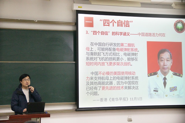 蔺伟从“四个自信的提出”“中国特色社会主义”“四个自信的科学含义”三个方面对“四个自信”进行深入讲解。通过对中国特色社会主义历程各个阶段的深入分析,剖析了其特有的历史必然性和优越性,通过生动贴切的视频讲解和准确的数据,向同学们展示了中国共产党的历史新变革,表达了对未来的展望。