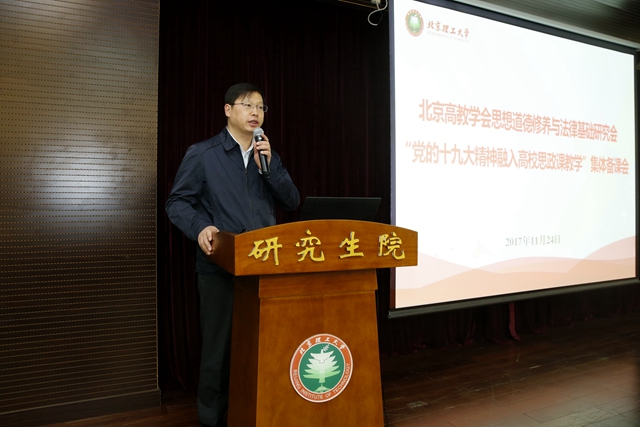 北京市委教育工作委员会宣教处处长王达品出席开幕式并致辞。他传达了党中央、教育部、北京市委、市委教育工委关于学习宣传贯彻十九大精神的工作要求,明确了当前高校思政课教学的工作重心。王达品强调,当前高校思政课的首要任务是推动十九大精神进教材、进课堂、进学生头脑,本次备课会是落实十九大精神“三进”工作的重要部署,王达品要求各高校和思政课教师提高政治站位、统一思想认识,充分了解和把握学生的思想动态、关注热点及理论困惑等多方面问题,齐心合力,形成多方联动机制,深入高效地推动十九大精神“三进”工作,切实提高思想政治理论课教育教学效果,并及时总结经验,推出教学成果。