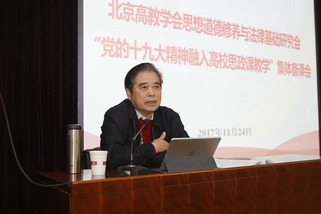 备课会邀请清华大学马克思主义学院吴潜涛教授,深入解读了党的十九大精神。吴潜涛从四个方党的十九大精神。他强调:“现在非常重要的任务,就是学习、领会党的十九大精神,把十九大报告、十九大精神如何及时地融入我们基础课的课堂之中,这可能是对我们基础课老师当前承担的使命,也是我们的基础课体现与时俱进性的非常重要的任务。”他围绕十九大精神的八个创新点,即“新成就、新变革、新时代、新使命、新思想、新方略、新部署、新要求”展开了论述,最后他指出:“要正确地认识一些理论的,在发展的过程中遇到新的问题,不要一看有一点点新,你不从根本上理解它的新,而是去想一提到新的东西,都想新的故事,在别人面前说歪理去显摆,这不是搞理论的立场,我们应该从本质上抓好理论建设。”