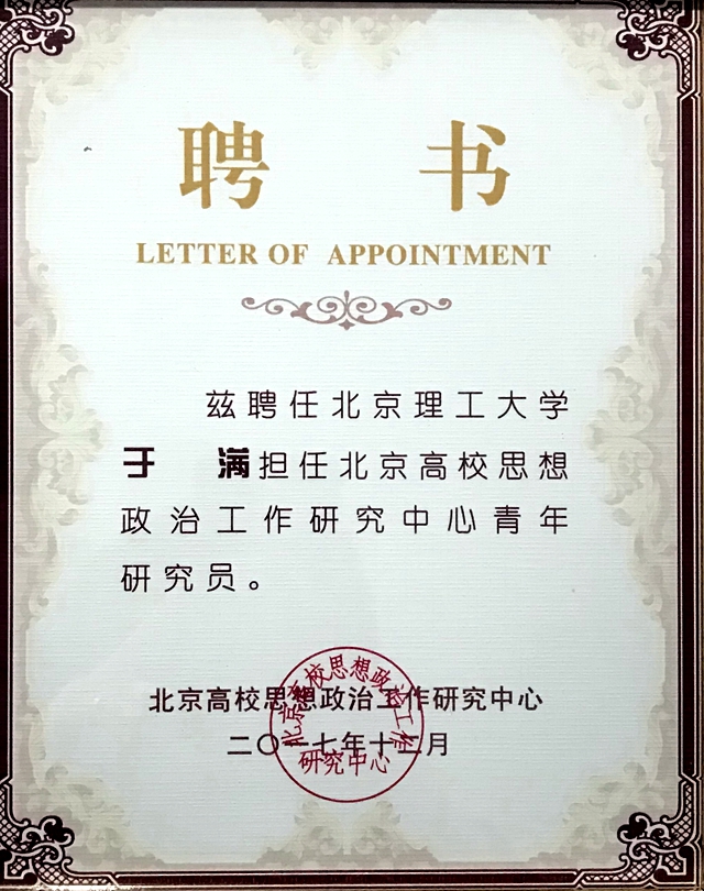 于满,2013年留校担任人文与社会科学学院辅导员,2017年1月至今担任机电学院学生工作办公室主任、团委书记、2014级本科生辅导员,兼任北京高校思想政治工作研究中心(原首都大学生思想政治教育研究中心)青年研究员。主讲形势与政策课、校社会实践培训课程等。曾获北京市青年教师调研优秀成果二等奖2次,主持首都思政课题、校思政课题等项目6项,参与课题曾获北京市优秀党建课题、北京高校社会主义核心价值观宣传优秀项目等,在《学位与研究生教育》、《思想政治教育研究》、《北京教育(德育)》等期刊公开发表思政教育学术论文10余篇。