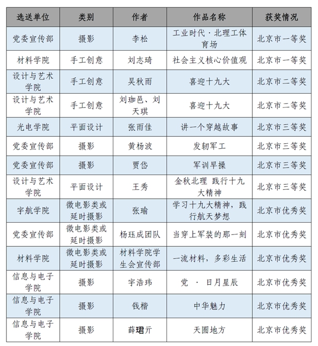 本次主题展览对42所高校的一二三等奖、优秀奖获奖作品进行了集中展示。整个展览分别展示了微电影、平面设计、原创歌曲、摄影、手工创意五大类作品,充分体现了首都高校大学生对于十九大精神和社会主义核心价值观的理解和诠释。