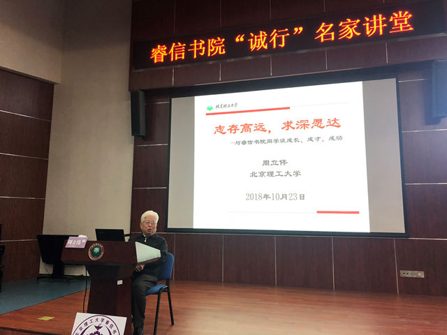 为引导睿信书院新生“担复兴大任,做时代新人”,10月23日,睿信书院在良乡校区综合教学楼报告厅举办周立伟院士思政报告会。报告题为《志存高远,求深愿达—与睿信书院同学谈成长、成才、成功》。睿信书院全体学生工作干部及近300名新生聆听了本次报告。