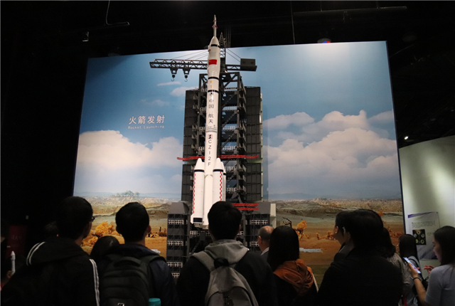 讲座结束之后,同学们来到了科技馆四层的“太空探索”展厅。展厅设置了飞天之梦、登天之梯、人造卫星、载人飞天、奔向月球、迈向深空六个主题展区。从嫦娥奔月到万户飞天,再从我国第一颗人造卫星“东方红一号”发射到玉兔二号驶抵月球表面,展馆生动形象的展示了中国航天从历经艰辛到举世瞩目的曲折历程,给同学们留下了深刻的印象。