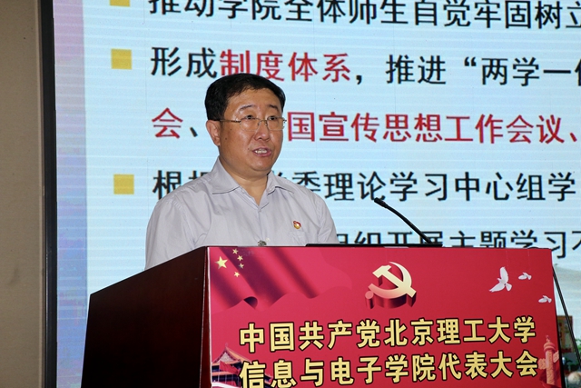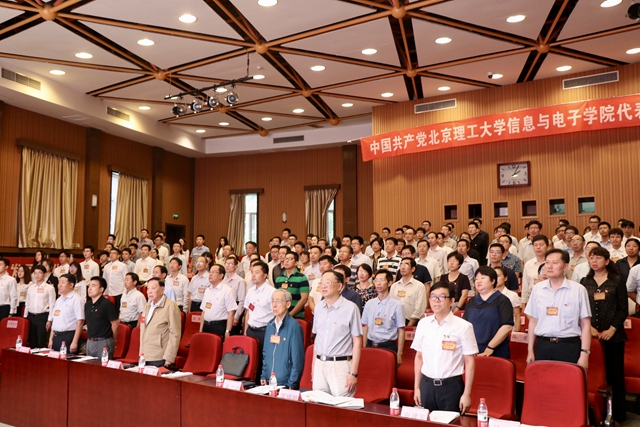 会议在庄严的国歌声中拉开序幕。信息与电子学院党委书记薛正辉代表学院党委向大会作了题为《凝心聚力促发展,深化改革创一流,为开创学院事业发展和党的建设新局面而奋斗》的工作报告。报告回顾了四年来学院党委在学校党委的领导下,在学院党员群众、师生员工的大力支持下,紧密围绕立德树人根本任务,不断加强党的建设和思想政治工作,认真贯彻落实学校第十四次党代会提出的发展战略和目标、“双一流”建设的目标任务,团结带领全院师生,坚持社会主义办学方向,聚焦质量和内涵建设,锐意进取,在党的建设、人才培养、学科建设、师资建设、科学研究、社会服务与文化传承等方面取得可喜的新成绩,取得了丰硕的成果,为推进学院改革发展和“双一流”建设提供坚实的思想、政治和组织保障。同时也分析了当前面临的形势与挑战,提出了今后五年学院发展的目标、任务、战略和举措,阐述了党建和思想政治工作的主要任务。凝心聚力,锐意进取,建设具备冲击世界一流潜力的信息与电子学科,聚集一批具有国际水准的高水平师资,形成特色鲜明的创新人才培养体系,产出一批具有重大影响力的科技创新成果,构建具有信息学院特色的国际化办学体系,为双一流建设做出新的更大贡献。