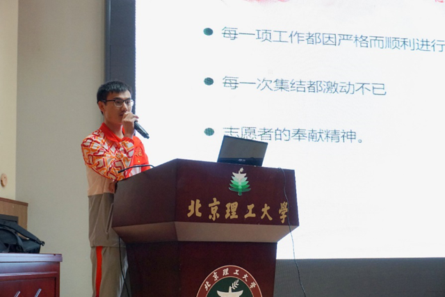 餐包服务志愿者代表、材料学院兼职辅导员蔡怀建讲述了他的亲身经历,他从“我们是谁”“我们做了什么”“我们怎么做的更好”和“我们的感想与收获”四个方面展现了他们作为餐包服务志愿者的工作,从视频培训到实地演练,为了在国庆当天有更好、更高效率的表现,餐包服务志愿者们认真训练、不怕苦累,在实战中磨练,在演练中提升,最终圆满完成保障补给任务。