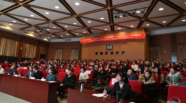 为进一步贯彻落实学校“不忘初心、牢记使命”主题教育和全面从严治党工作要求,进一步加强学生党员教育培养,提高学生党建工作质量,1月5日,管理学院“不忘初心 牢记使命”主题教育专题党课暨学生党员承诺书签订仪式在七号楼报告厅举行。学校党建专家徐其敏、管理学院党委书记颜志军出席活动,包括2019年下半年发展的102名预备党员在内的近200名学生党员、党建组织员、辅导员参加活动。活动包括党课讲授、集体宣誓、佩带党徽、党员代表发言、党员承诺书签订等环节。