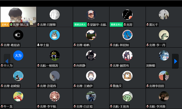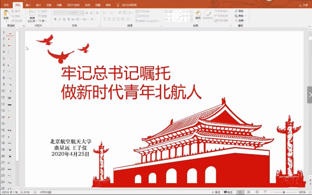 北航航空学院学生党员曲星远、王子仪分享了“牢记总书记嘱托,做新时代青年北航人”主题微党课,展现了青年北航人在社区战“疫”、学研战“疫”和宣传战“疫”三个方面的出色表现。